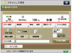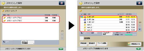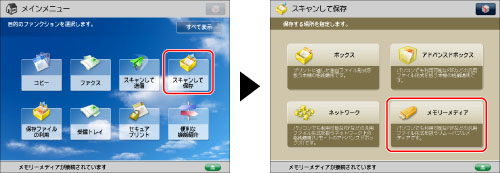 工場出荷時は、メモリーメディアの表示が「OFF」に設定されています。メモリーメディアを利用するには、[保存先の表示設定]を「ON」に設定してください。(→保存先の表示を設定する)