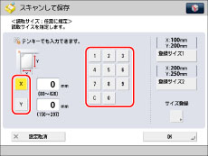 [X][Y]を押す→テンキーを使用して、mm単位で用紙サイズを入力