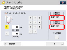 [自動]で読み取れない原稿を使用するときや、とくにサイズを指定する必要があるときに設定します。指定したサイズを登録することもできます。