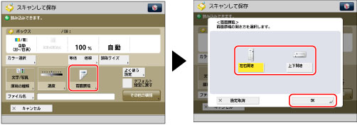 [両面原稿]を押す→原稿の開きかたを選択→[OK]を押す