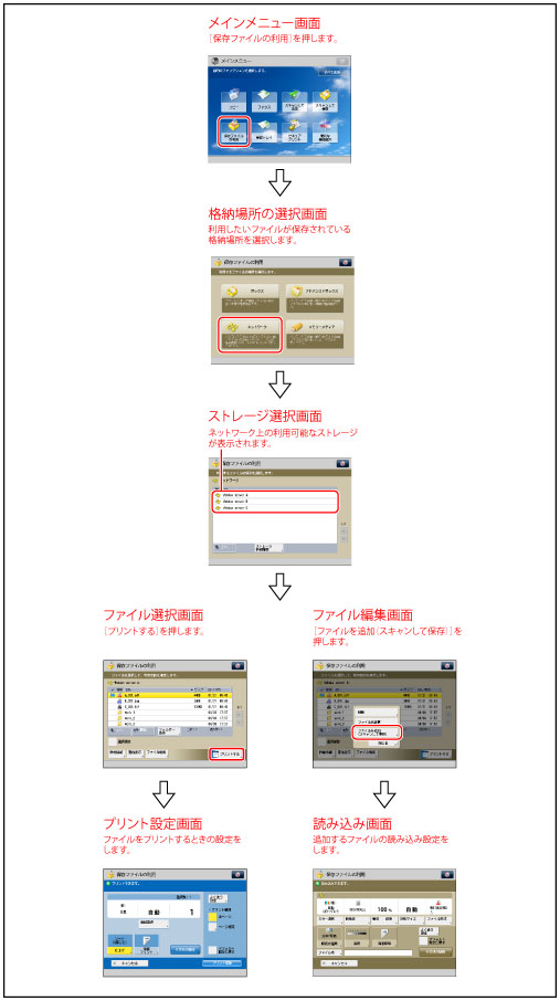 [ファイルを追加(スキャンして保存)]の操作および読み込み画面の操作手順については、「ファイルを追加する(スキャンして保存)」、「スキャンして保存の操作の流れ」を参照してください。
