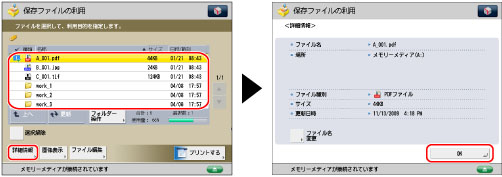 メモリーメディア内のファイルの詳細情報(ファイル名、場所、更新日時)を確認できます。