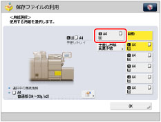 [用紙カセット自動選択のON/OFF]で「OFF」に設定した用紙カセットの用紙には自動用紙選択ではプリントできません。(→機能ごとに給紙箇所を自動で選択する)また「ON」に設定されているカセットでも、用紙種類によっては自動用紙選択されない場合があります。自動用紙選択されない用紙カセットをお使いになる場合は、手動で指定したあとプリントしてください。