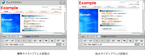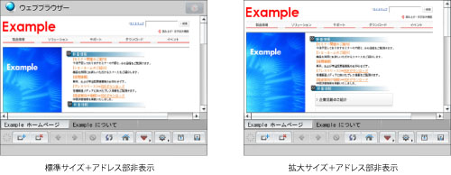 使いかたに合わせてウェブブラウザーの画面表示を変更できます。画面表示は、画面サイズとアドレス部の表示/非表示の組み合わせによって、4種類の表示方法があります。