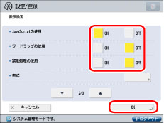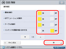 設定する項目を選択して[ON]または[OFF]を押したあと、[OK]を押す。