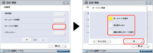 [オートクリア設定]を押す→オートクリア後の表示画面を選択→[OK]を押す