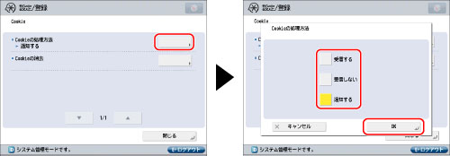 工場出荷時は[Cookieの処理方法]は「受信する」に設定されています。