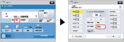 指定した倍率と実際のコピーサイズに誤差が生じたときは、[ズーム微調整]で調整できます。(→ズームの微調整をする)