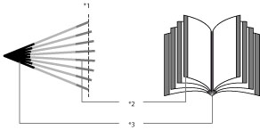 中綴じフィニッシャー・Q1で中とじ出力をした場合、出力する用紙枚数と用紙サイズ、および厚紙(81 g/m2以上)を使用した表紙の有無によって異なります。