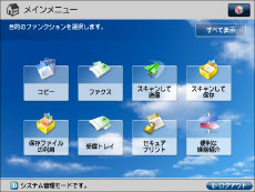 [部門別ID管理]を「ON」に設定し、ファンクション制限の対象となっている機能を起動/復帰後に表示する画面として設定した場合は、起動/復帰後の画面にメインメニュー画面が表示されます。([コピー]は、[部門別ID管理]が「ON」に設定されていれば、ファンクション制限の対象となります。)起動/復帰後に表示する画面として設定した機能を表示させるには、メインメニュー画面でファンクションキーを選択したあと、ログイン画面で部門ID/暗証番号を入力してください。