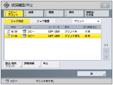 デフォルト画面の変更(状況確認/中止)を[コピー/プリント]、[ジョブ状況]、[プリント]に設定している場合