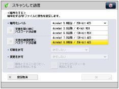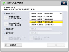 暗号化PDFについての詳細は[スキャンして送信]の「原稿を暗号化したPDFにする(暗号化する)」、もしくは[スキャンして保存]の「原稿を暗号化したPDFにする(暗号化する)」を参照してください。