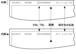 例:発信元記録を「つける」、相手先略称の表示を「ON」に設定した場合、相手先の記録紙には次のようにプリントされます。