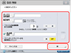 すでに各ボックスで設定されている場合、各ボックスの暗証番号設定にかかわらず、[ファンクション設定](設定/登録)の[ボックス一括設定]から、ボックスの[ファイルの自動削除までの時間]、[プリンタードライバーから保存時のプリント]のON/OFFの設定を行うこともできます。ボックス一括設定後に各ボックスで設定を更新した場合は、[ボックス一括設定]の設定内容よりも優先されます。(→ボックスを一括で設定する)