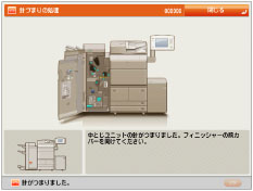 針づまりが起きると、タッチパネルディスプレーに、針づまり箇所と処理方法を示す画面が表示されます。画面の指示に従って処理してください。画面は、針づまりが処理されるまで繰り返し表示されます。[閉じる]を押すと、針づまりをすぐに処理しなくてもモードの設定、原稿の読み込みなどの操作を続けることができます。