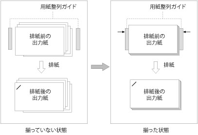 温度・湿度の影響や用紙の特性により、コピー/プリントした用紙が縮小することがあります。その場合、本機能でフィニッシャー内部の用紙整列ガイドの位置を調整し、用紙が揃わずにステイプルされるのを防ぐことができます。