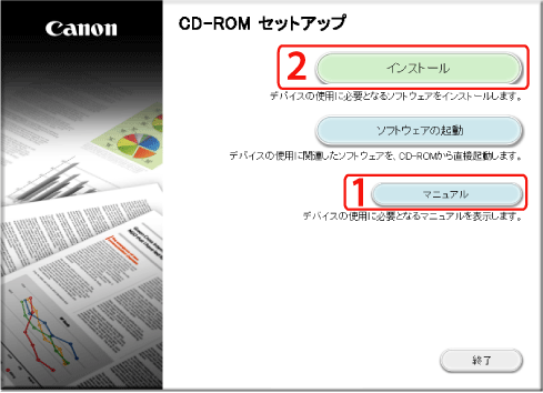 「Network ScanGear インストールガイド」を参照するとき、最初にクリックします。インストール開始後は、インストールガイドを表示できません。