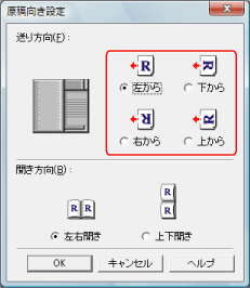 両面原稿を読み取るときは、[開き方向]で原稿の開き方も指定します。