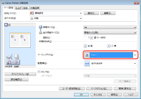 [ページレイアウト]で項目が選択できない場合は、[コントロールパネル]からプリンターのプロパティ画面を表示して[デバイスの設定]タブをクリックしたあと、[内部スプール処理]から[自動]または[必ずホスト側で処理を行う]を選択してください。プリンターのプロパティ画面の表示方法については、「プリンターのオプション設定をする」を参照してください。