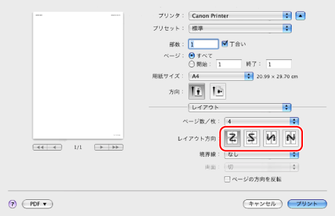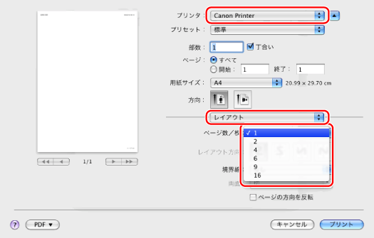 お使いのプリンター→[レイアウト]→[ページ数/枚]から用紙1枚に配置するページ数を選択