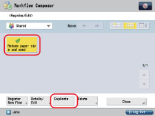 Select the flow to duplicate ([Reduce paper size and send]) → press [Duplicate].