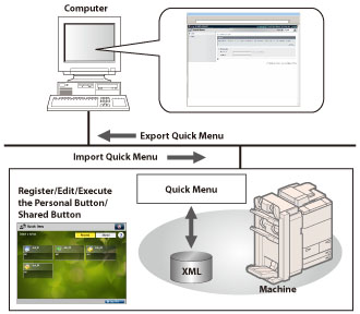 The Quick Menu is a function that increases the efficiency of operations that use functions of the machine for an office. You can create and register frequently used function settings such as Copy, Fax, Scan and Send, and Scan and Store in a button.