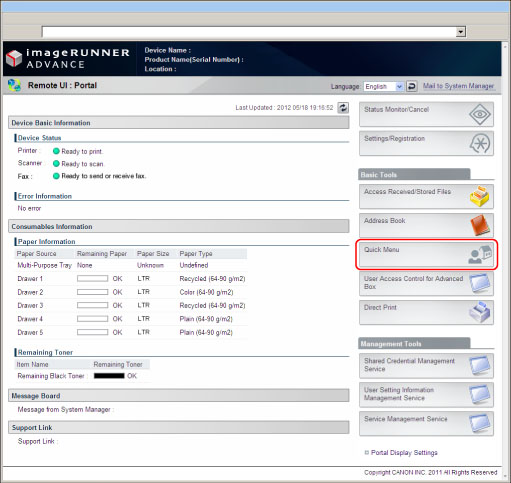 Only the System Manager, or SSO-H System Administrator (Administrator)/Network Administrator (NetworkAdmin)/Device Administrator (DeviceAdmin) can operate the Quick Menu Page. For information on the types of administrators, see "Administrator Settings."