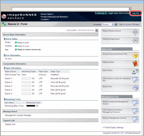 For information on the Remote UI system requirements and preliminary steps to launch the Remote UI, see "System Requirements" and "Before You Start the Remote UI."