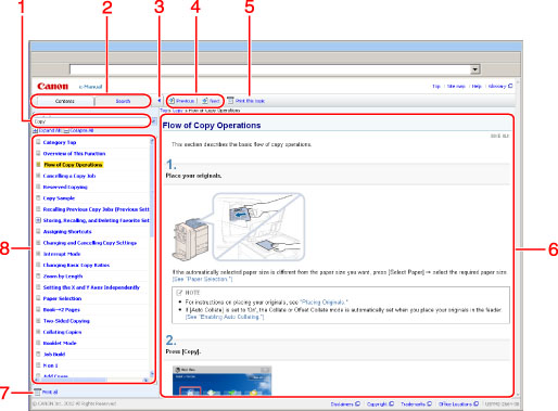 The explanatory pages under each category in the e-Manual are called "topics." They appear in a screen similar to the one below.