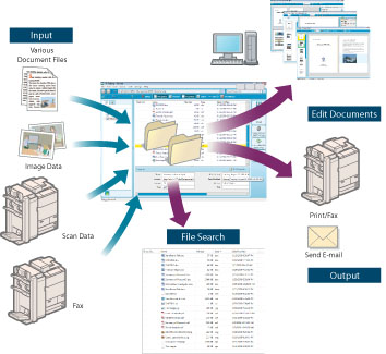 imageRUNNER ADVANCE Desktop, a core software program among the component products of imageRUNNER ADVANCE Essentials, is an integrated document management application that is capable of importing, editing, printing, sending, storing and managing documents.