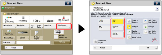 If you select PDF or XPS as the file format, you can set [Compact] and [OCR (Text Searchable)] at the same time. In that case, [PDF (Compact)] or [XPS (Compact)] is displayed as the file format on the Scan and Send Basic Features screen.