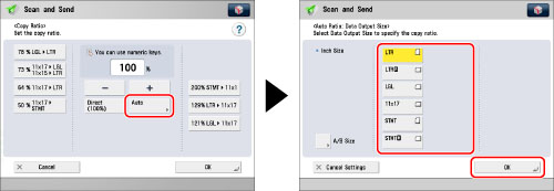 If you set PDF (Trace & Smooth), PDF (Compact), PDF (OCR), XPS (Compact), XPS (OCR), or OOXML as the file format, you can only send at a zoom ratio of [Direct (100%)] or [Auto].