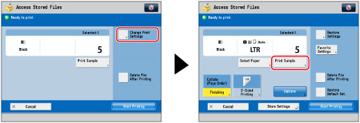[Print Sample] appears only if you set to make multiple prints of your original with [Collate (Page Order)], [Offset], [Staple], [Add Cover], [Insert Sheets], [Print on Tab], or [Booklet].