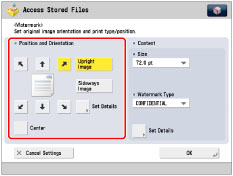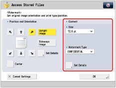 You can also select text that has been registered in [Register Characters for Page No./Watermark]. (See "Registering/Editing/Deleting User-Defined Text for Page Numbers and Watermarks.")