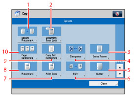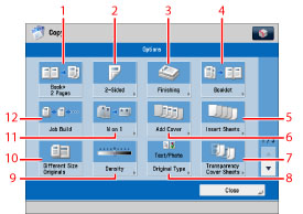 Press to select a [Options] mode. [Finishing], [2-Sided], [Density], and [Original Type] are set as default. |