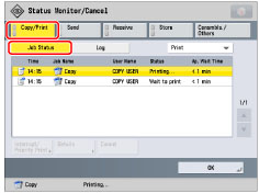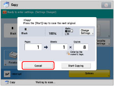 If you press [Cancel] on the pop-up screen that appears while the machine is copying or waiting to copy, you can cancel the job that is copying or the last job that you scanned an original for that is waiting to copy.