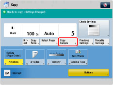 [Copy Sample] appears only if you set to make multiple copies of your original in [Collate (Page Order)], [Offset], [Staple], [Add Cover], [Insert Sheets], [Booklet], or [Transparency Cover Sheets].