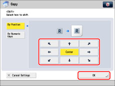 If you select [By Numeric Keys], the original image may be partially cut off on the copy. The amount cut off depends on the size of the original, the size of the copy paper, and the amount of shift specified.