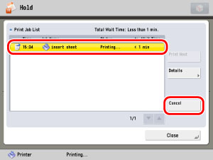 The printing of a file stored in the Hold Que can be cancelled from the touch panel display and Status Monitor/Cancel screen.