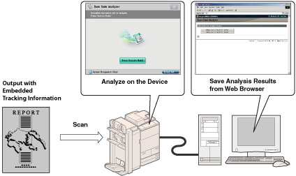 You can analyze embedded tracking information on the output, and find out who, when, and with which machine the document was output. The information analyzing tool is required to analyze tracking information. For more information, see "Document Scan Code Analyzer for MEAP" in the manual.