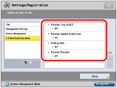You can only output copies/prints by operating the Limited Functions Mode to restrict all of the functions for the finisher such as staple and collate.