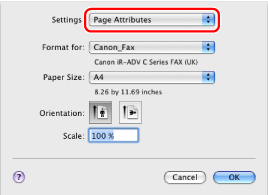 Select your fax from [Format for] → set [Paper Size], [Orientation], and [Scale] as necessary → click [OK].