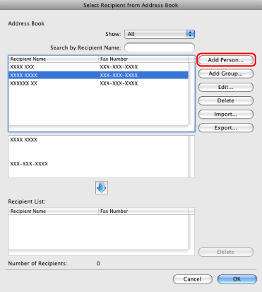 To delete a registered personal address from the address book, select a personal address from the recipient list in the [Select Recipient from Address Book] dialog box, and click [Delete].