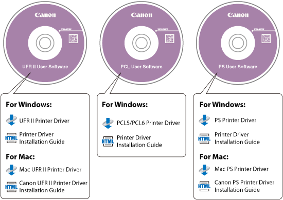 The printer driver is installed from a User Software CD-ROM. If there is more than one CD-ROM, use the following information as a reference and select the appropriate CD-ROM and printer driver.