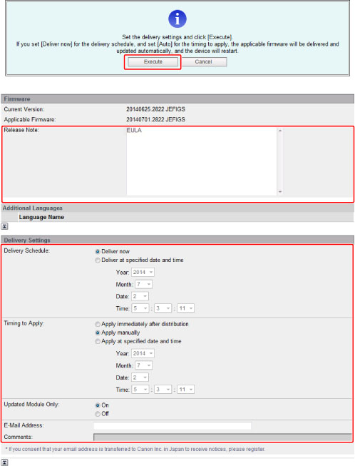 [Deliver now]: Downloads the firmware after the delivery setting is specified.