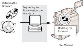 You can update the firmware of the machine to the most recent version using the "Register/Update Software" function from the Remote UI.