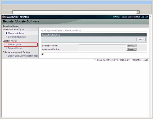 From the portal page of the Remote UI, click [Settings/Registration] → [License/Other] → [Register/Update Software].