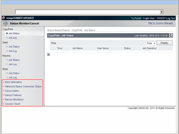 You can use the Remote UI (User Interface) to check the machine's current status, such as the amount of paper remaining in the various paper sources, and to check for any errors. You can also obtain information on the machine's system manager, the location where the machine is installed, and the machine's protocol settings.