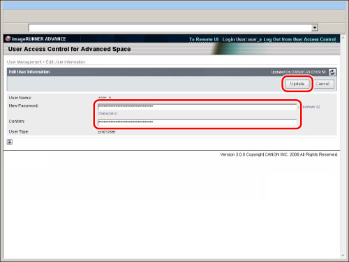 Enter the new password in [New Password] and [Confirm] → click [Update].