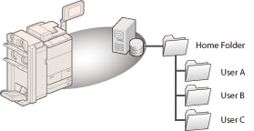When setting up the home folder on the Windows (SMB) shared folder, you do not have to prepare user folders. If a folder named with a login user name is not prepared under the home folder, the folder is created automatically.